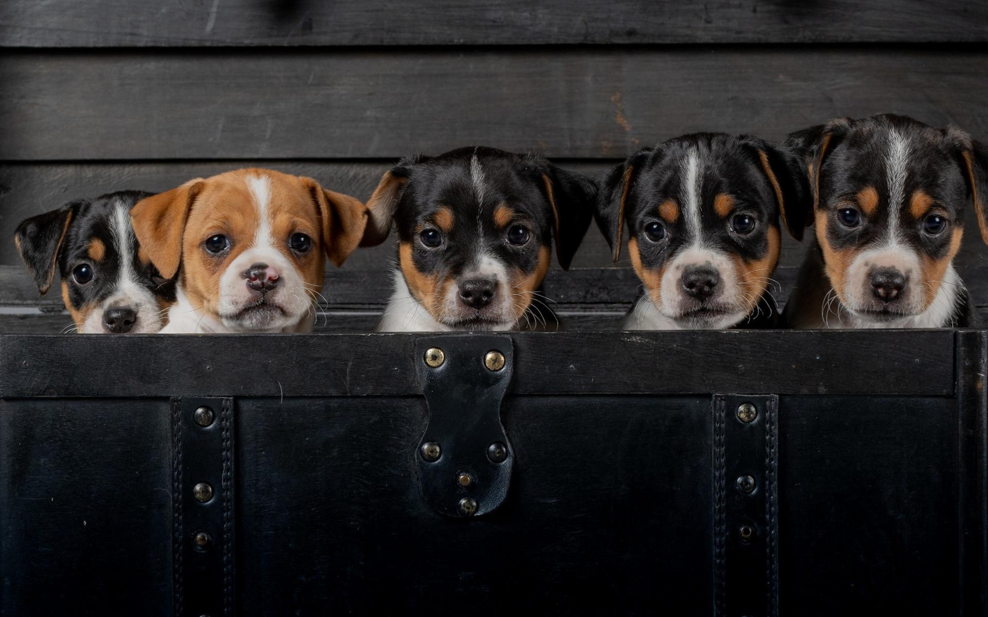 Wallpaper Little funny puppies are sitting in a black suitcase.