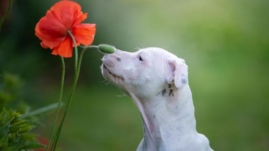 Wallpaper White purebred dog sniffs a red poppy flower