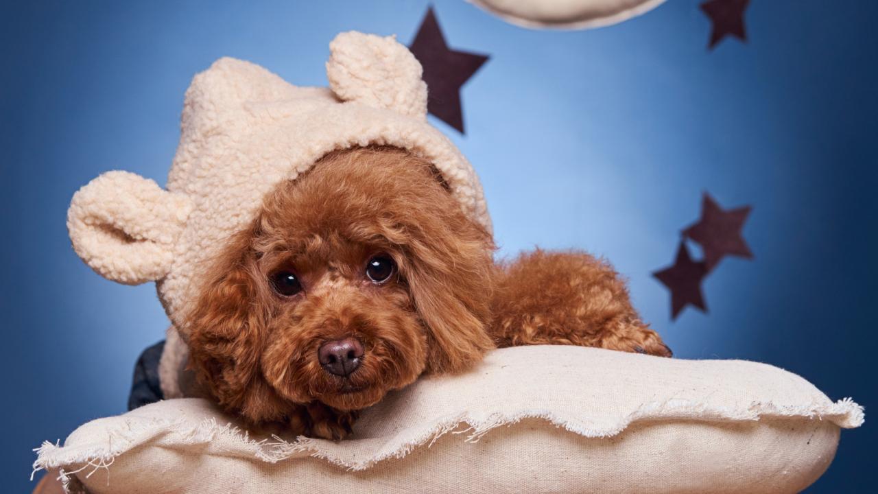 Wallpaper Cute brown poodle in a suit getting ready for bed