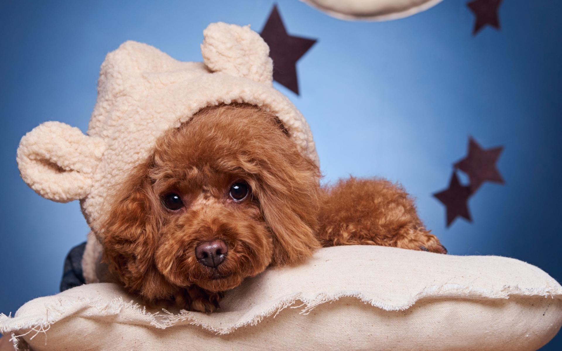 Wallpaper Cute brown poodle in a suit getting ready for bed