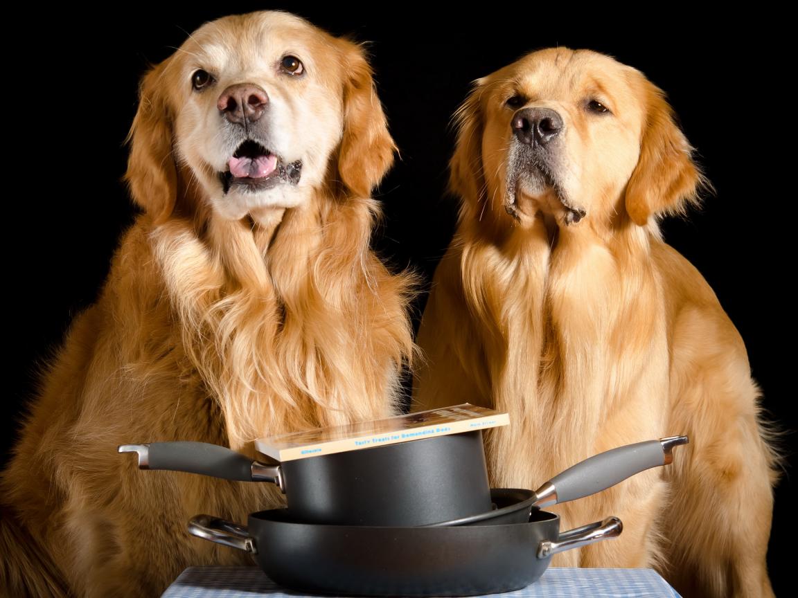 Wallpaper Two golden retriever with pans and a book on a black background