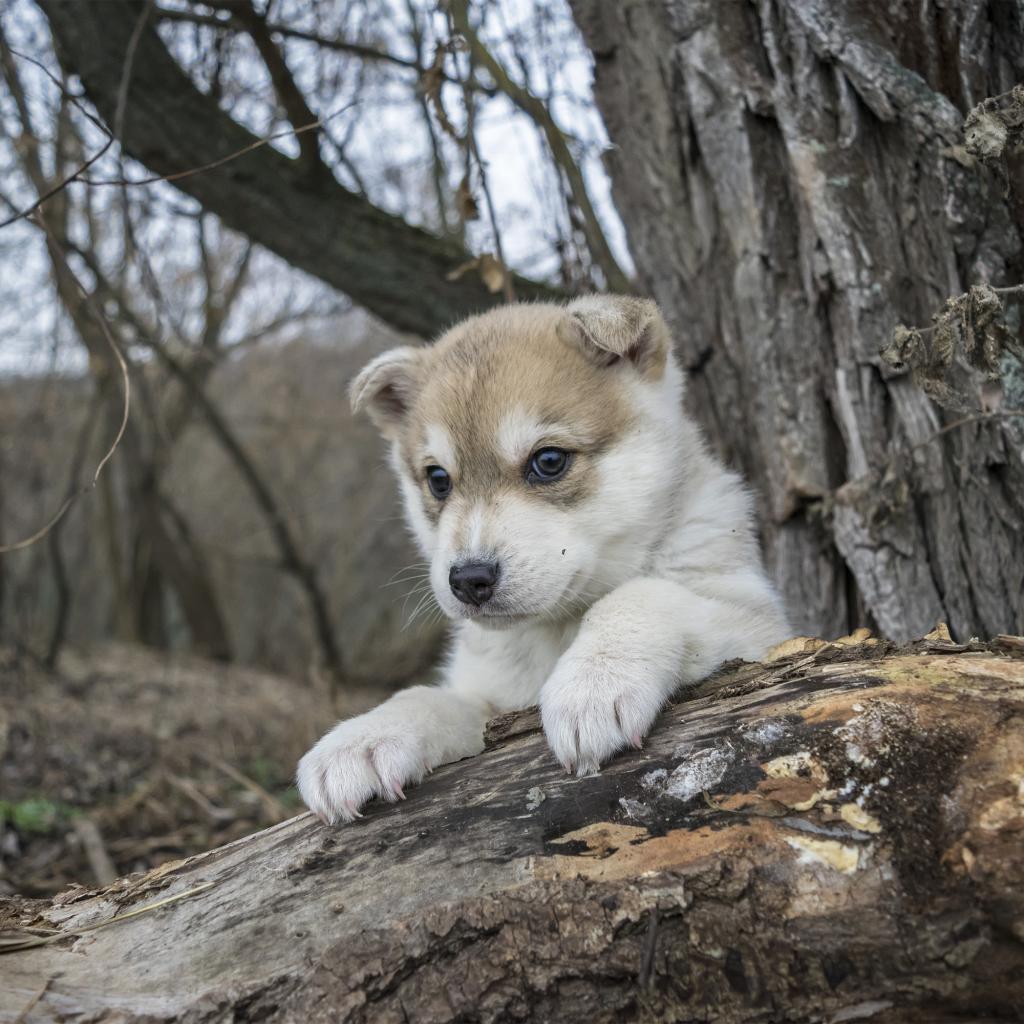 Wallpaper Little puppy sits on a dry tree in the forest