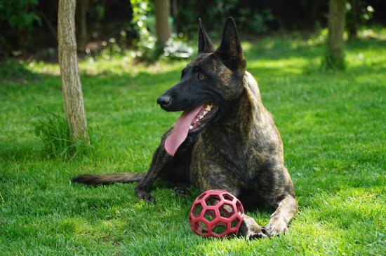 Wallpaper Sheepdog with tongue hanging out with a ball on green grass