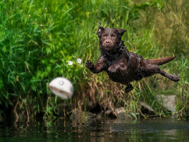 Wallpaper Wet Labrador Jumps Into The Water For A Ball