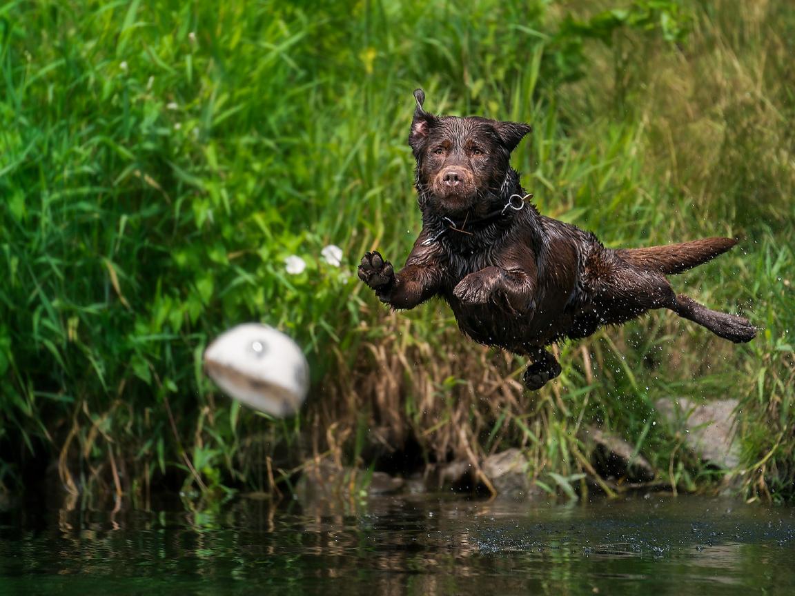 Wallpaper Wet Labrador Jumps Into The Water For A Ball
