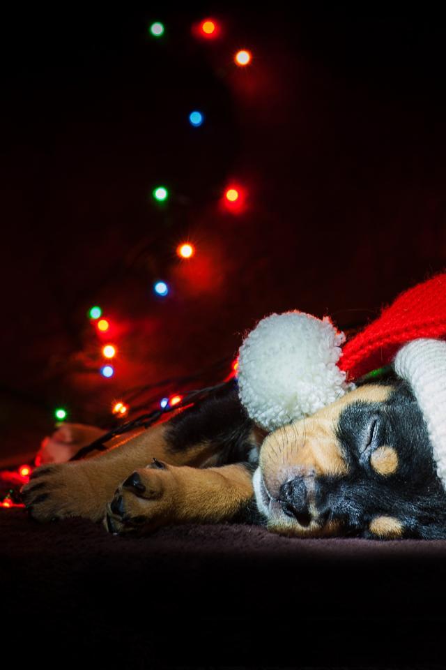 Wallpaper Cute sleeping puppy wearing a santa hat