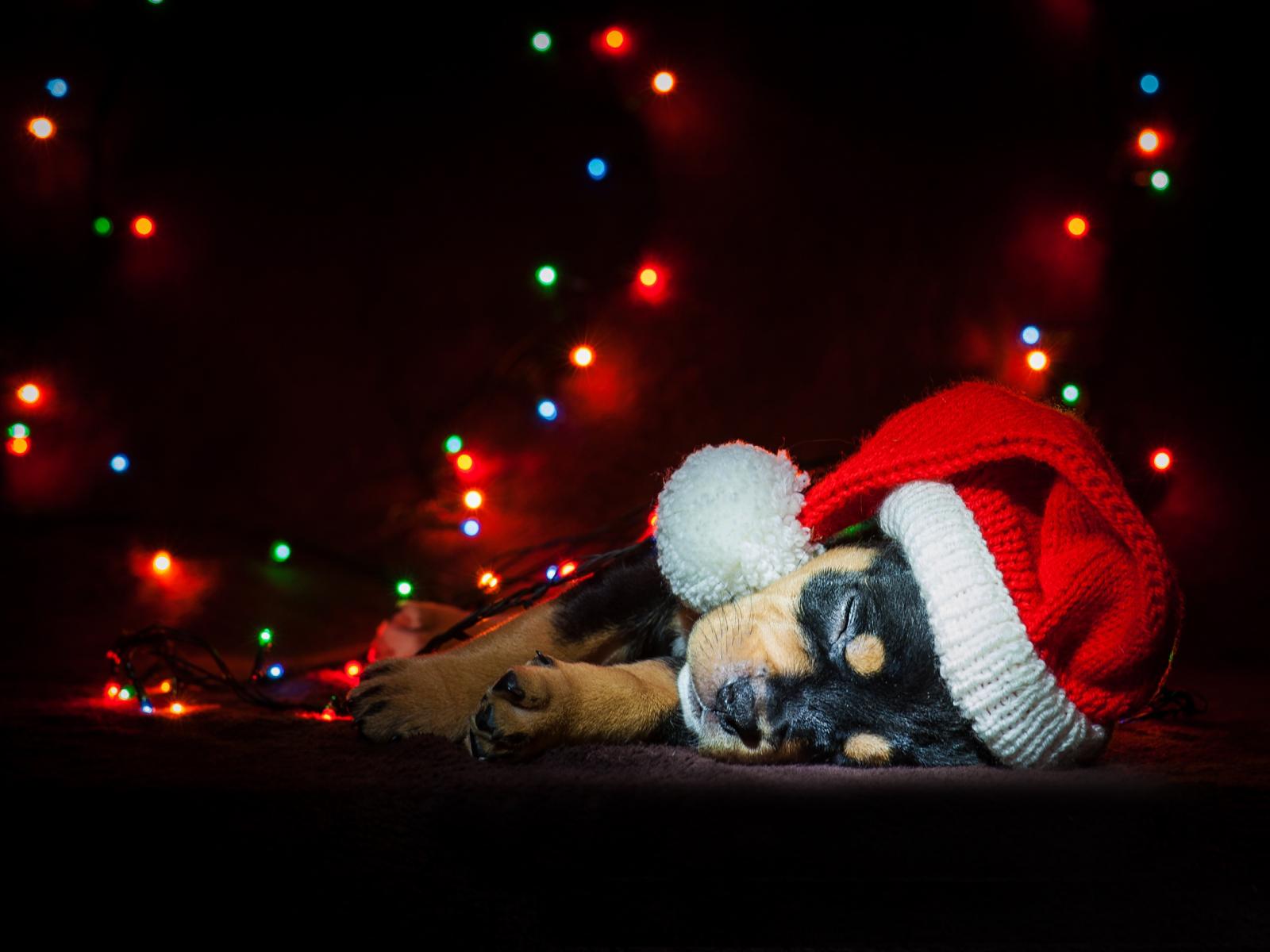 Wallpaper Cute sleeping puppy wearing a santa hat