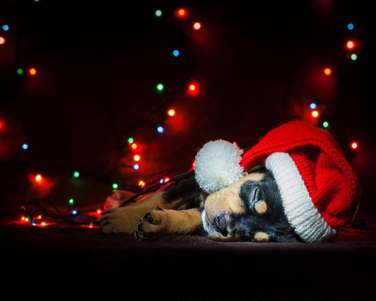 Wallpaper Cute sleeping puppy wearing a santa hat