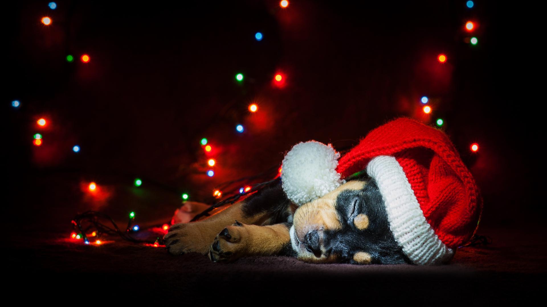 Wallpaper Cute sleeping puppy wearing a santa hat