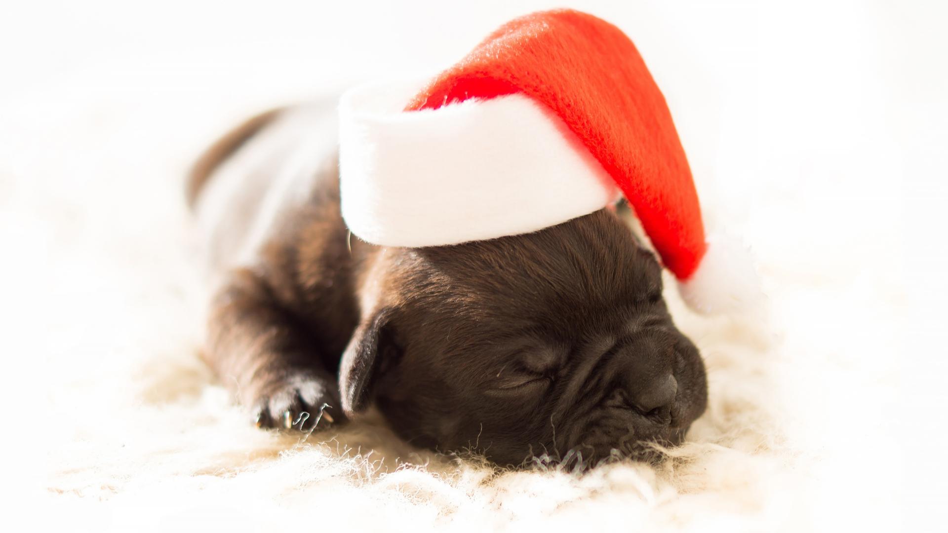Wallpaper Little newborn puppy in a santa hat