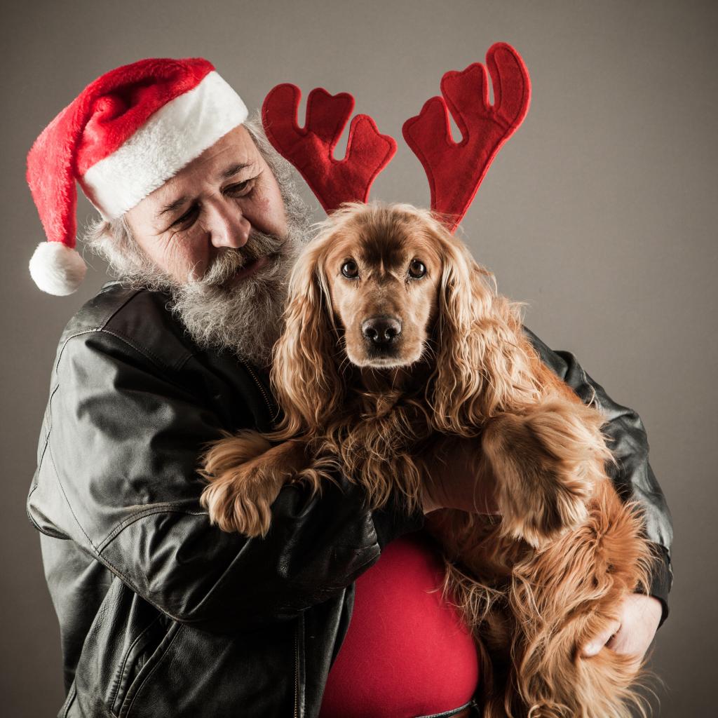Wallpaper Santa Claus with a dog in hands on a gray background