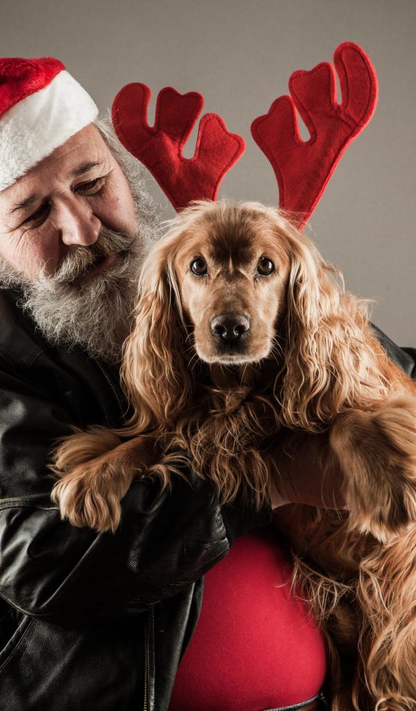 Wallpaper Santa Claus with a dog in hands on a gray background