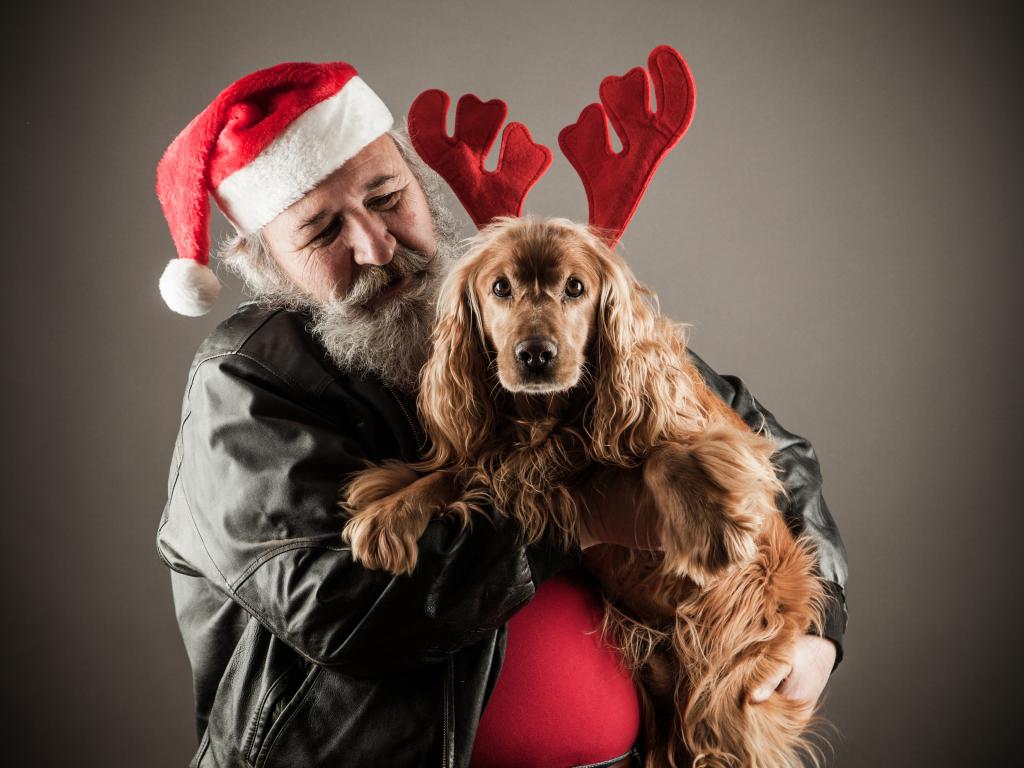 Wallpaper Santa Claus with a dog in hands on a gray background