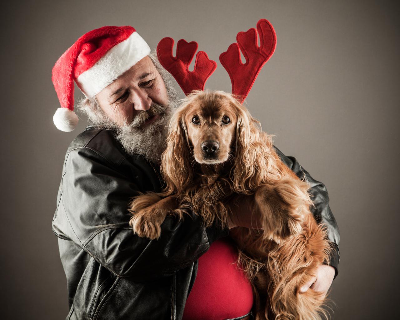 Wallpaper Santa Claus with a dog in hands on a gray background