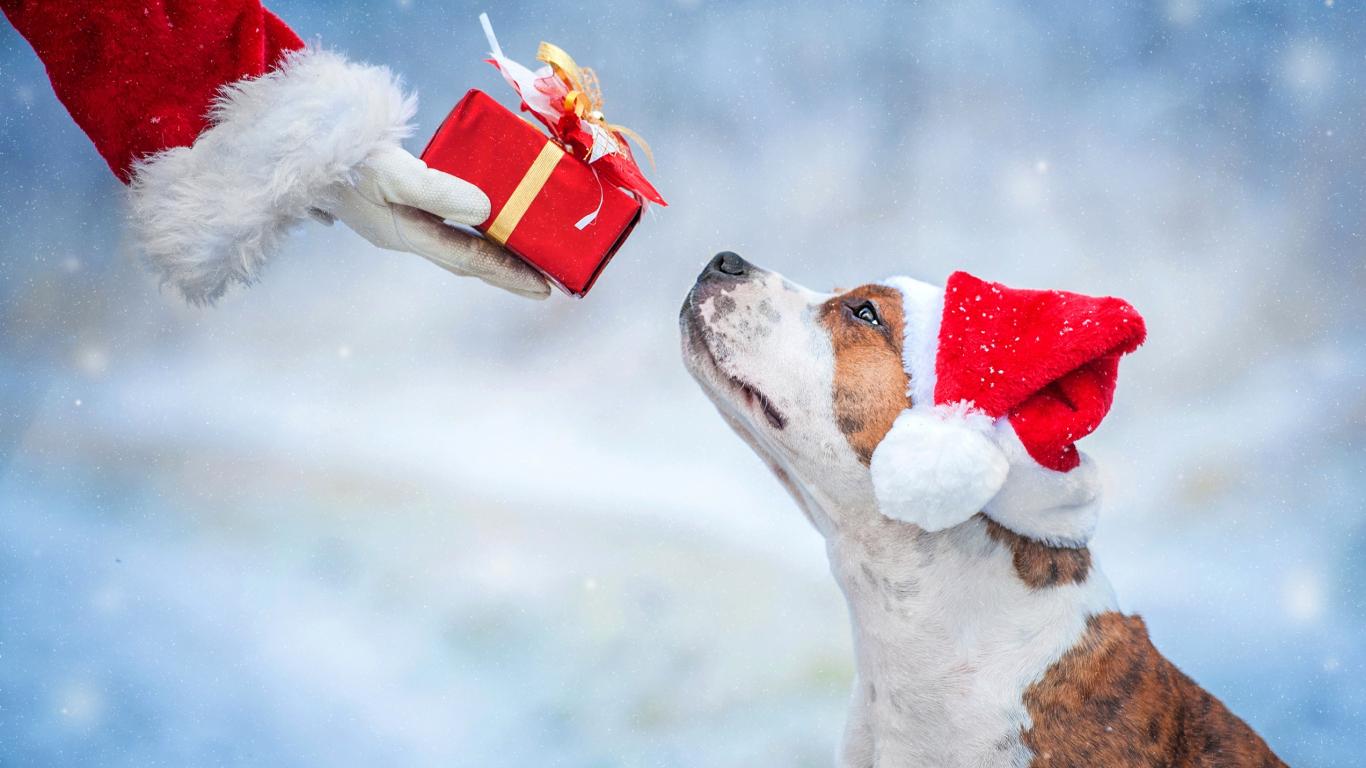 Wallpaper Santa Claus gives a gift to the dog for Christmas