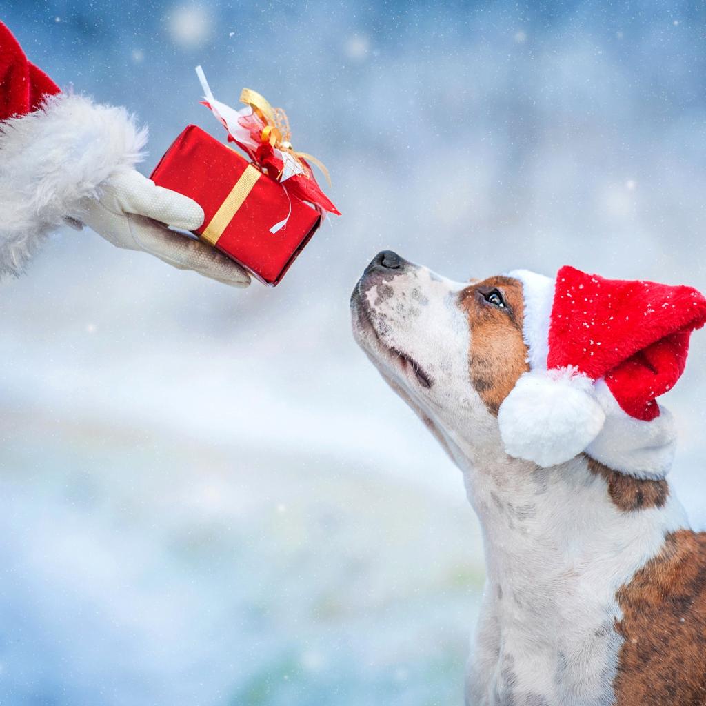 Wallpaper Santa Claus gives a gift to the dog for Christmas