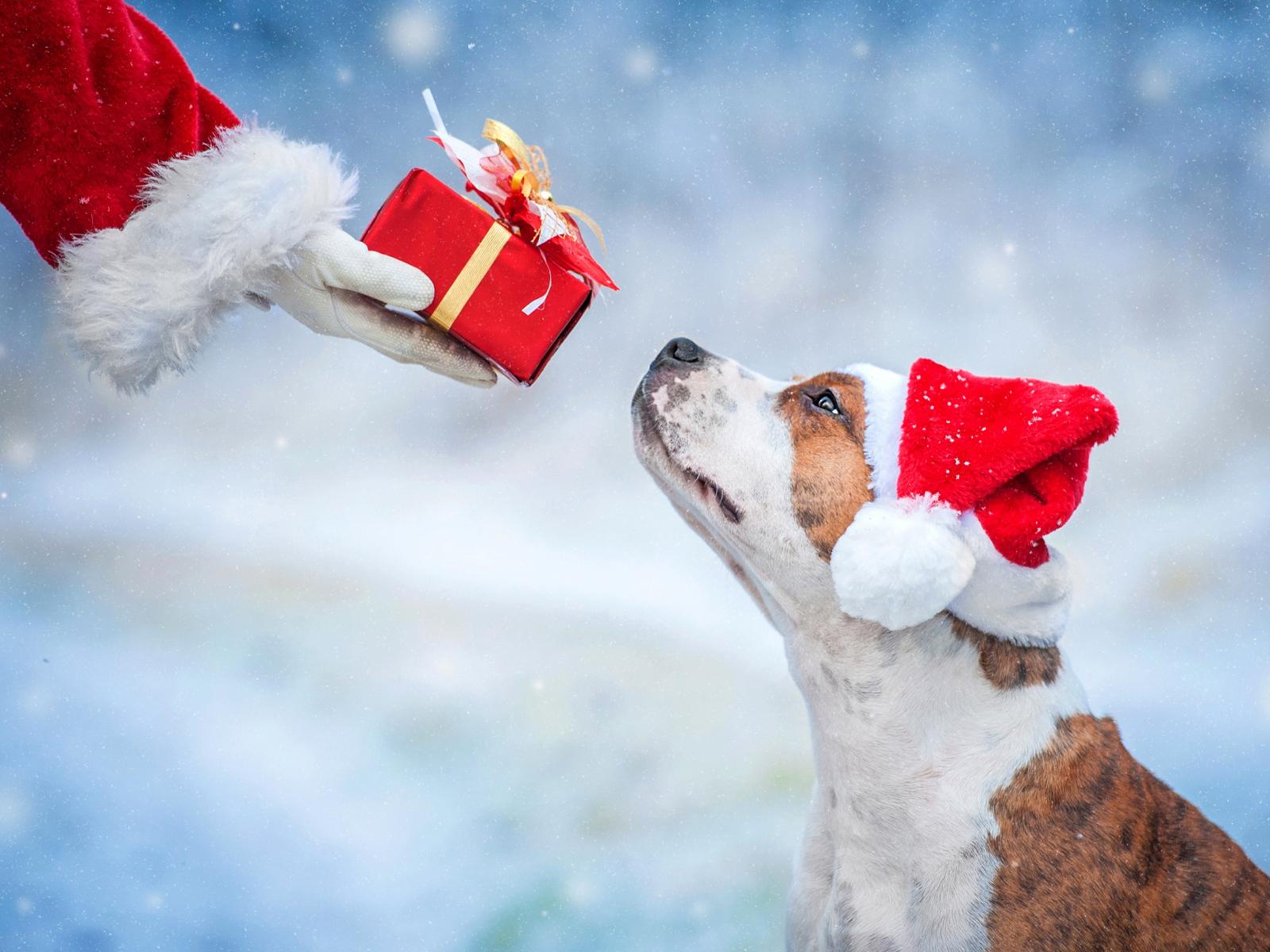 Wallpaper Santa Claus gives a gift to the dog for Christmas