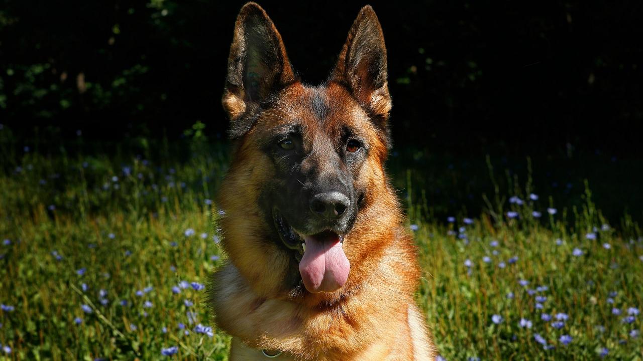 Wallpaper German shepherd dog with tongue hanging out on green grass