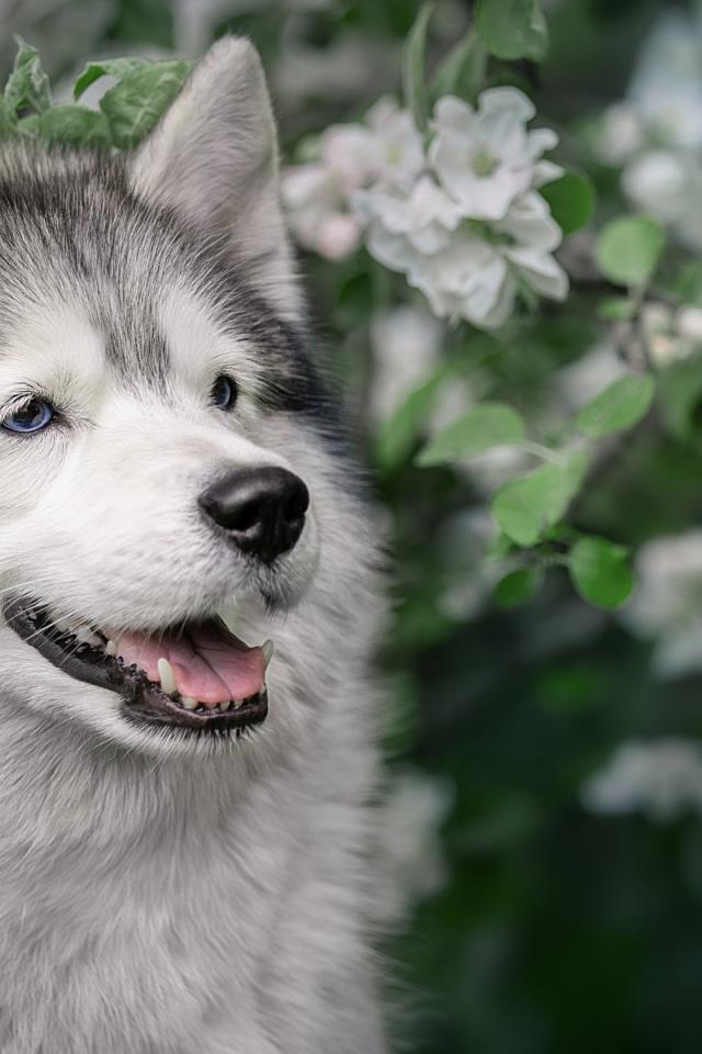 Wallpaper Husky with his tongue hanging out in apple blossom