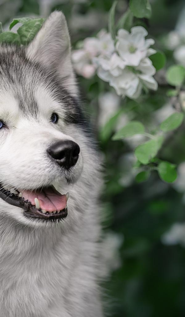 Wallpaper Husky with his tongue hanging out in apple blossom