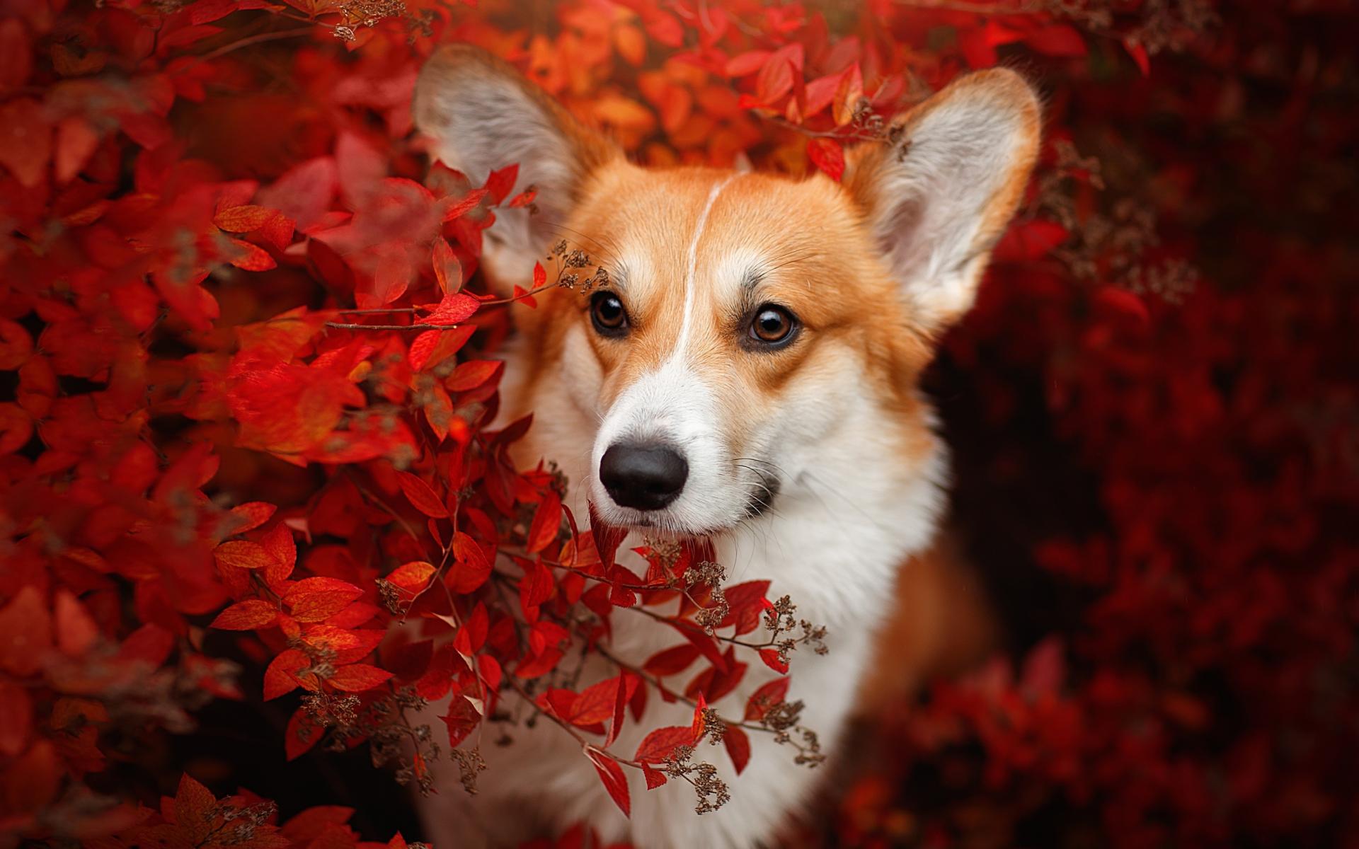 Wallpaper Red-haired welsh corgi dog in red leaves