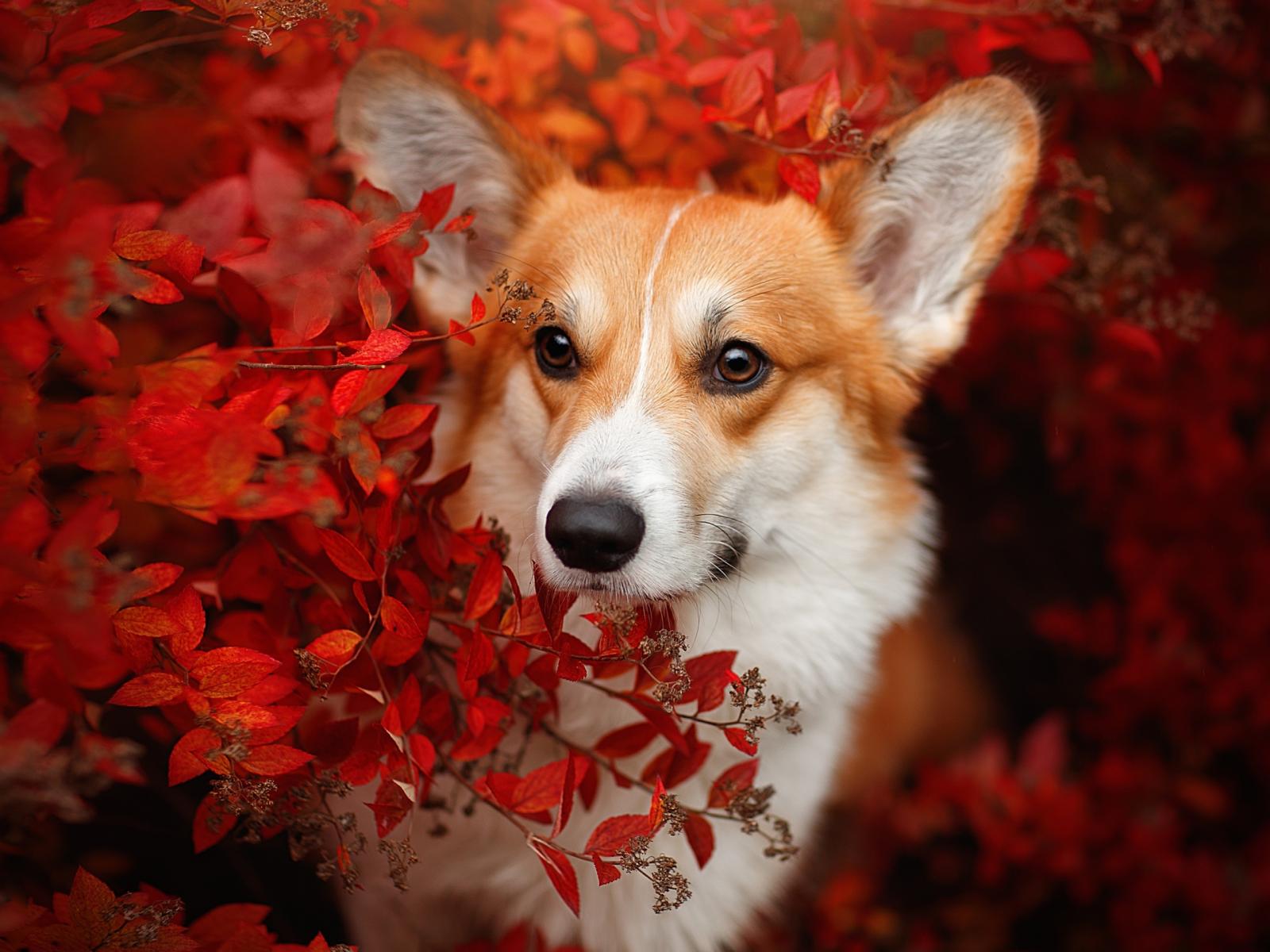 Wallpaper Red-haired welsh corgi dog in red leaves