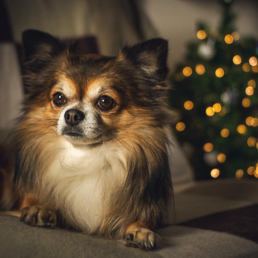 Wallpaper Chihuahua dog lies on the couch by the Christmas tree