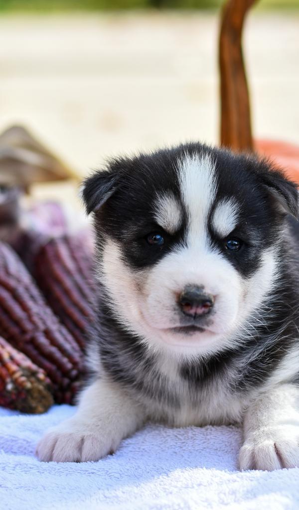 Wallpaper Little funny husky puppy on a blanket with pumpkins