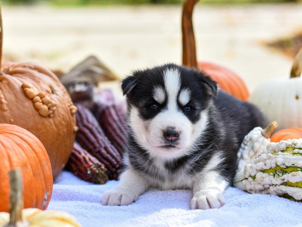 Wallpaper Little funny husky puppy on a blanket with pumpkins