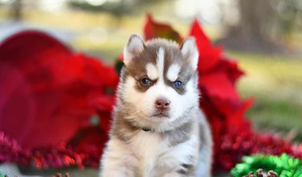 Wallpaper Puppy Husky with different eyes against the blue sky