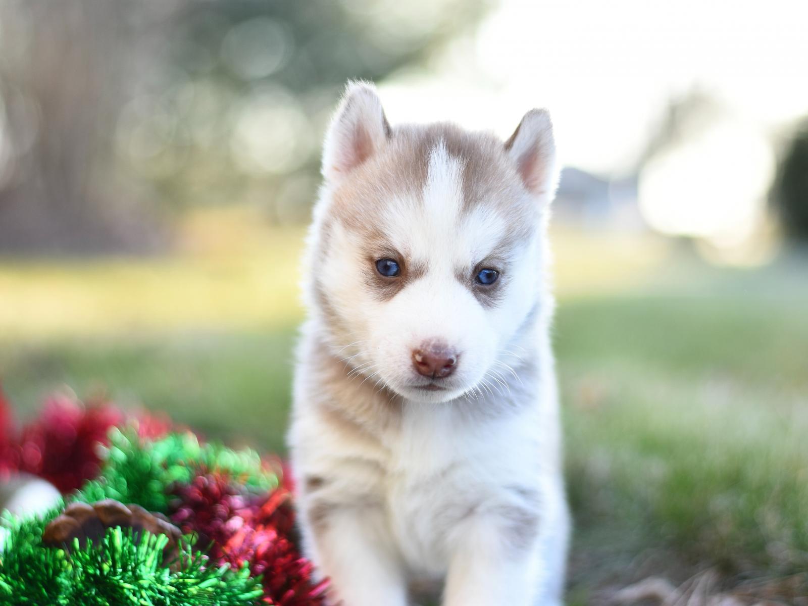 Wallpaper Little brown husky puppy with tinsel on the grass