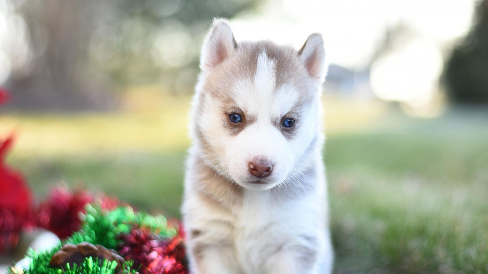 Wallpaper Little brown husky puppy with tinsel on the grass