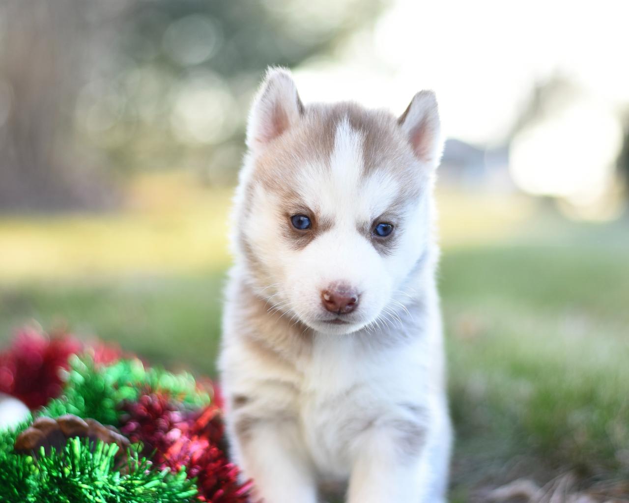 Wallpaper Little brown husky puppy with tinsel on the grass