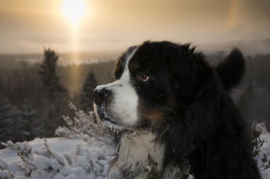 Wallpaper Bernese Mountain Dog in a snowy forest at sunset
