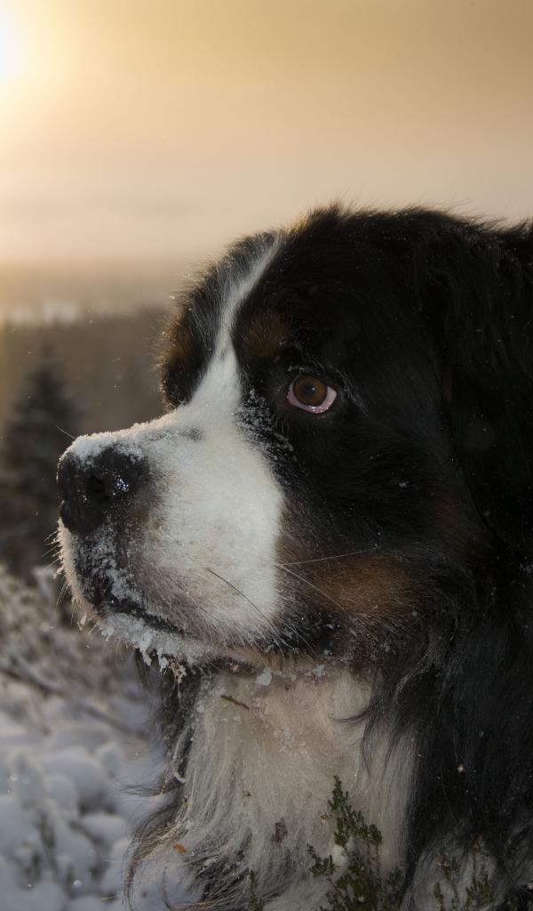 Wallpaper Bernese Mountain Dog in a snowy forest at sunset