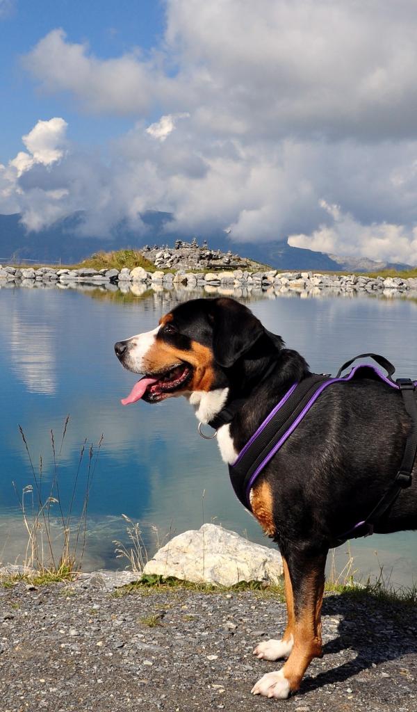 Wallpaper Bernese Mountain Dog with tongue sticking out by the water