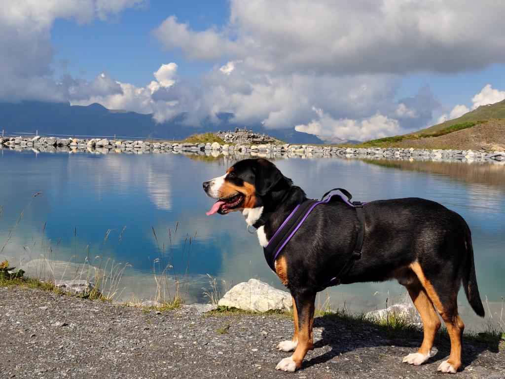 Wallpaper Bernese Mountain Dog with tongue sticking out by the water