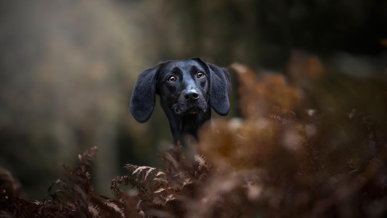 Wallpaper Black dog hides in the leaves