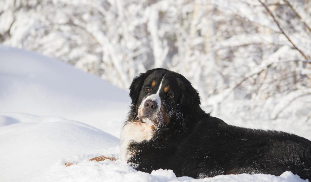 Wallpaper Bernese Mountain Dog lies in the cold snow