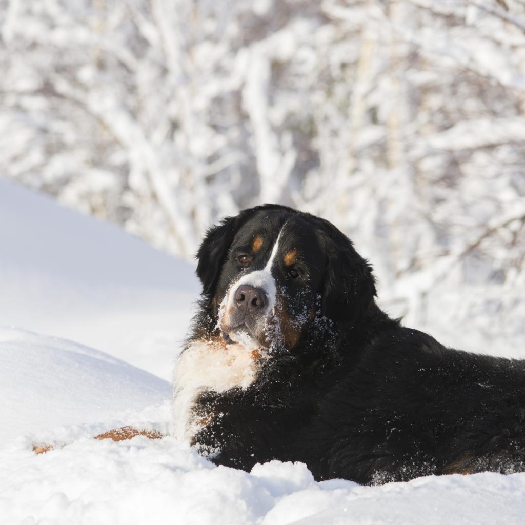 Wallpaper Bernese Mountain Dog lies in the cold snow