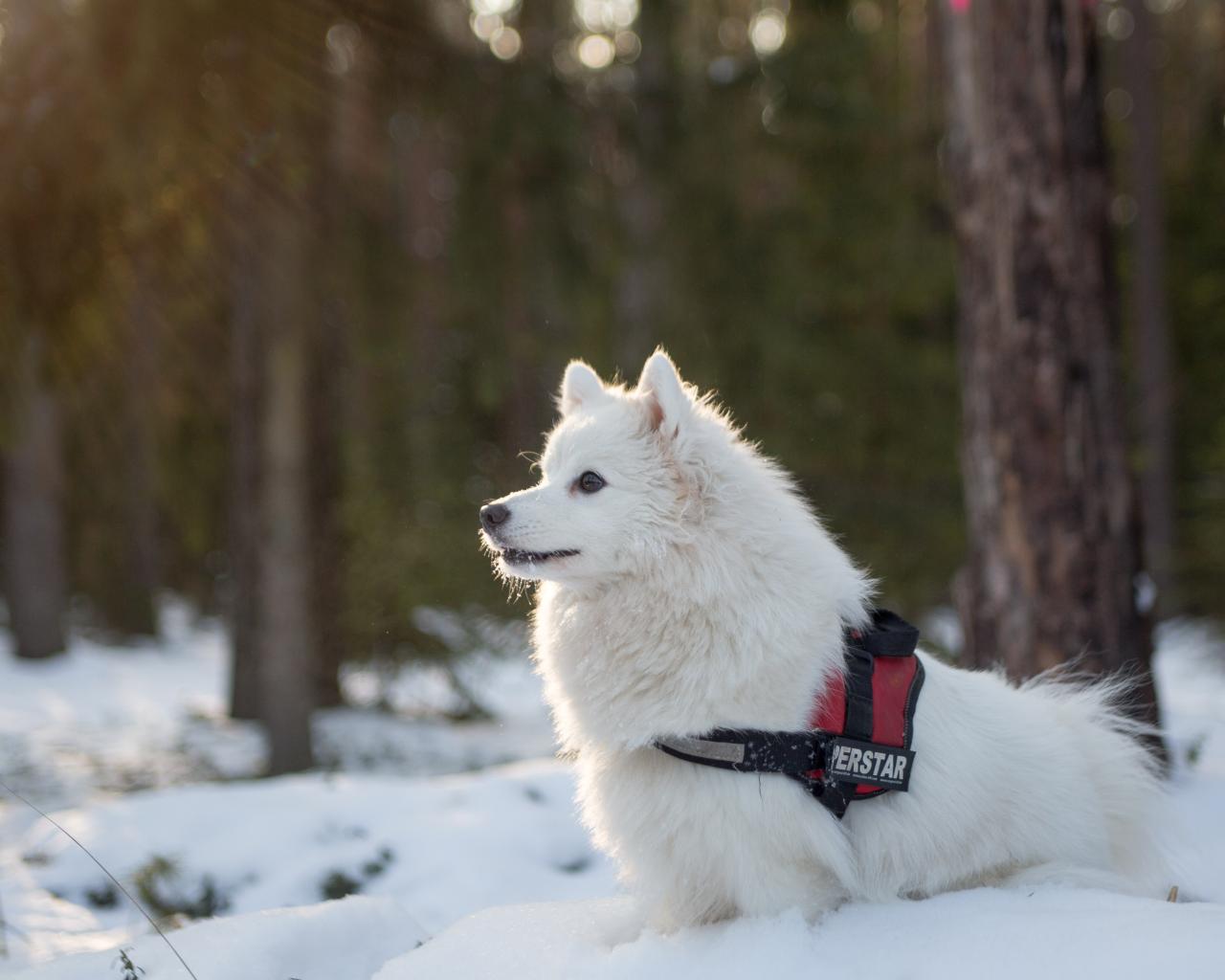 Wallpaper Purebred white dog walks in the snowy forest