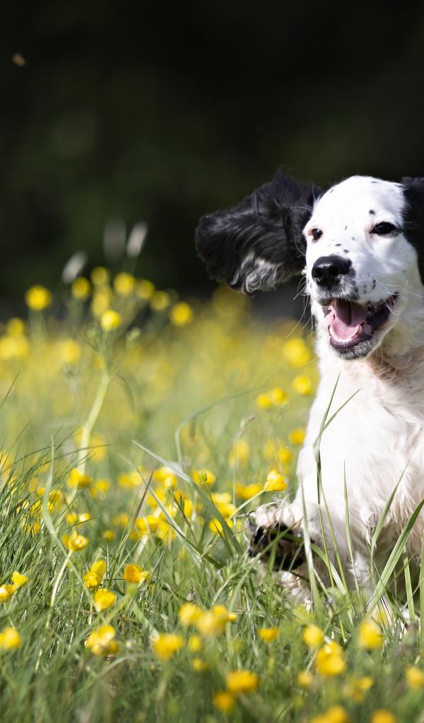 Wallpaper Cheerful puppy runs on green grass with yellow flowers