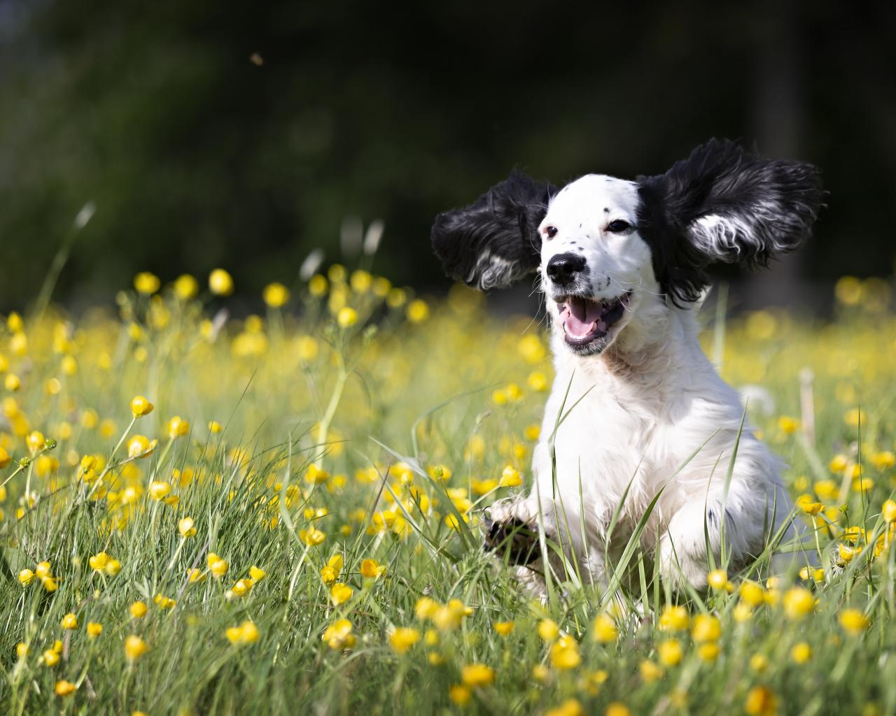 Wallpaper Cheerful puppy runs on green grass with yellow flowers