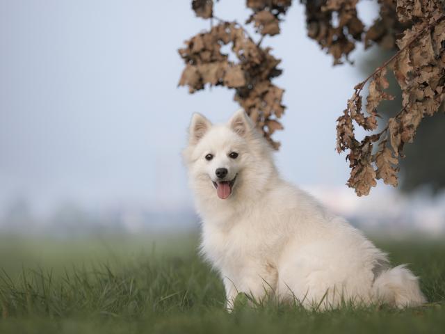 Wallpaper White dog Japanese Spitz breed sits on the grass