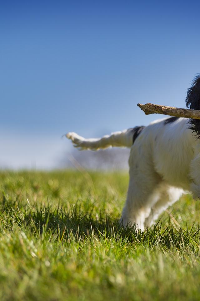 Wallpaper Cheerful puppy with a stick runs on the green grass