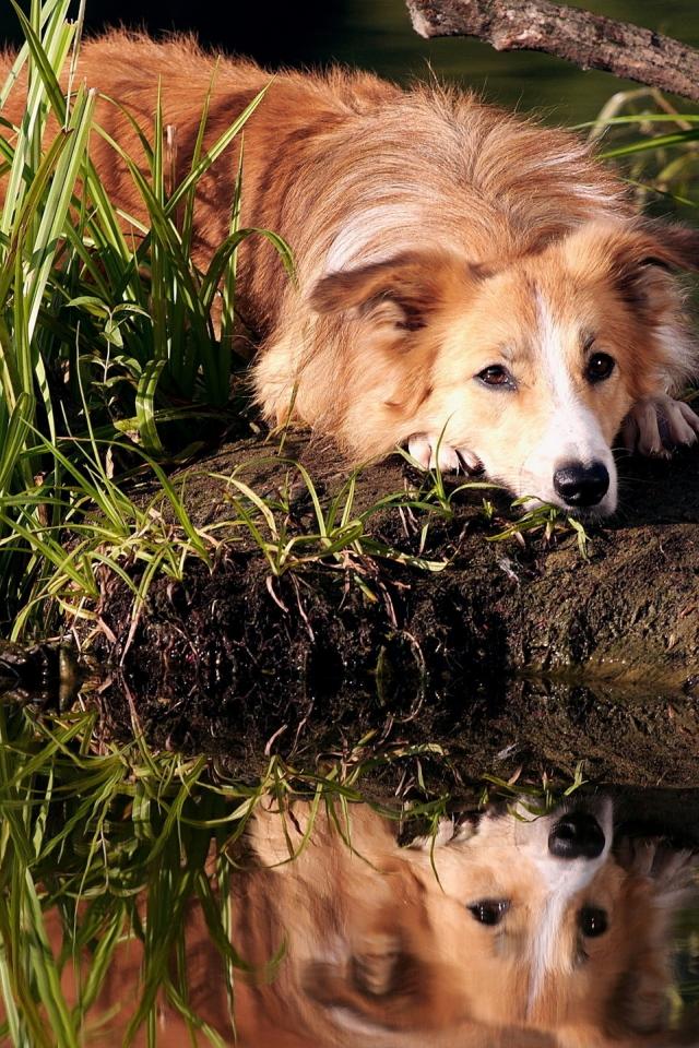 Wallpaper Sad ginger dog lies on the shore of the pond