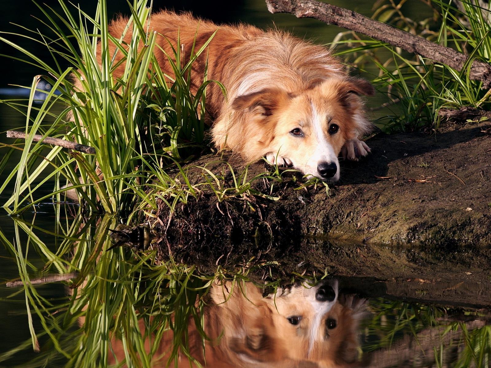 Wallpaper Sad ginger dog lies on the shore of the pond