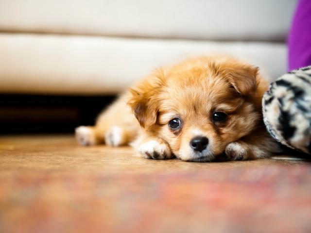 Wallpaper Little sad chihuahua puppy lies on the floor