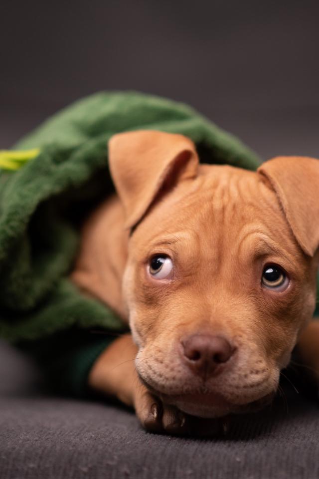 Wallpaper Red-haired puppy in a suit lies on the couch