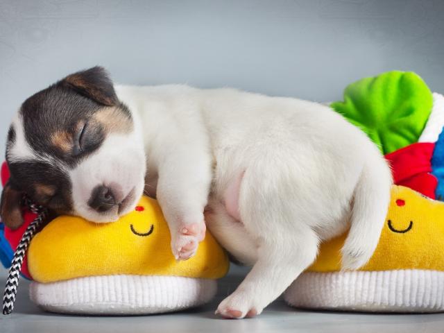 Wallpaper Puppy sleeping on baby booties